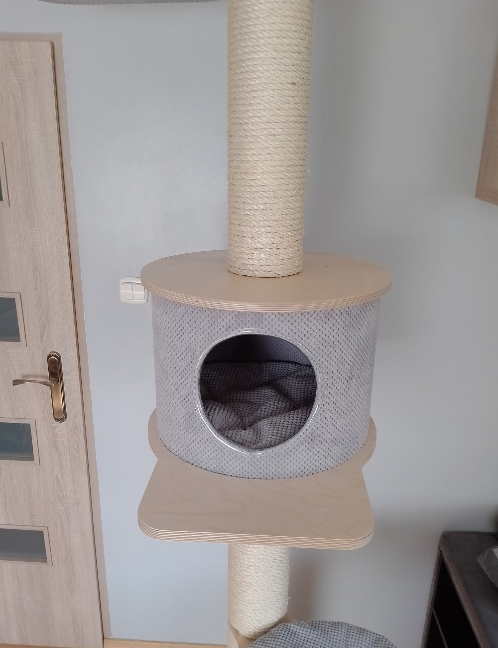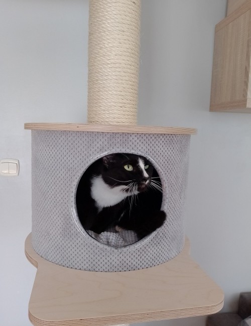 Dzięki odpowiedniemu rozmieszczeniu półki, hamaka i budki oraz ich dużej średnicy, konstrukcja drapaka jest bezpieczna zarówno dla kociąt jak i kocich seniorów.