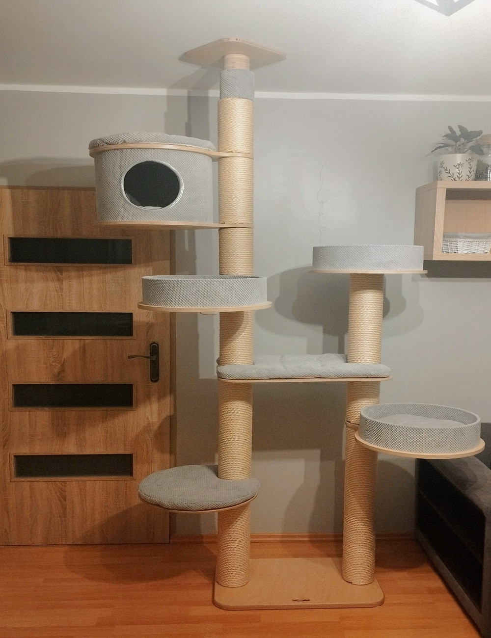 Każdy kot czerpie olbrzymią przyjemność z możliwości codziennego drapania i wspinaczki. Konstrukcja o kilku poziomach tworzy doskonałe miejsce nie tylko do kocich drzemek, ale również do zabawy. Drapak wyposażony jest w solidne słupy, duże półki dla kota, rozety, koci hamak i domek dla kota.