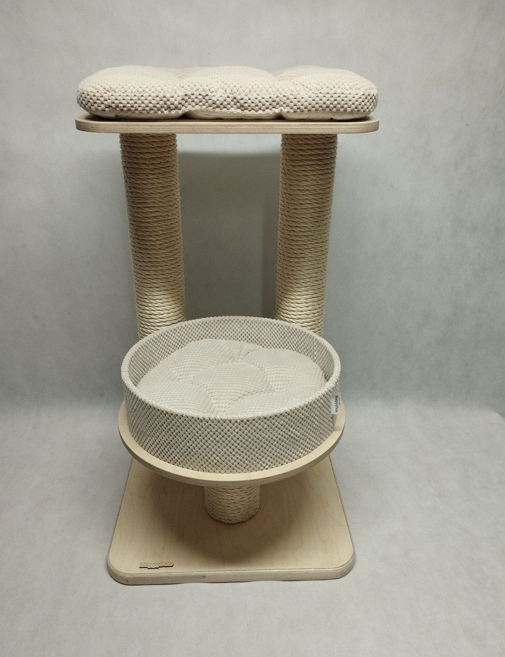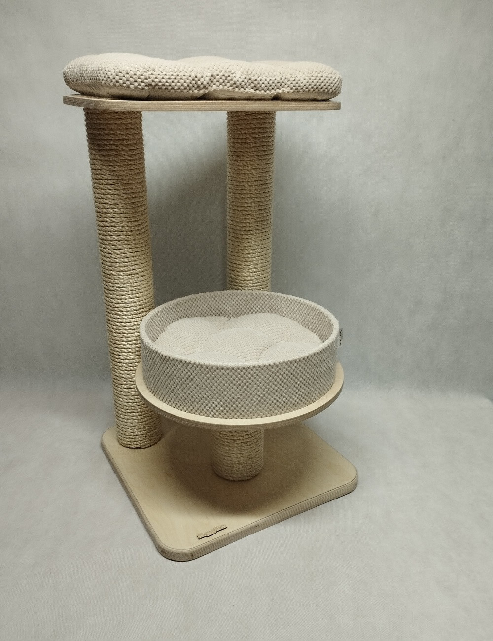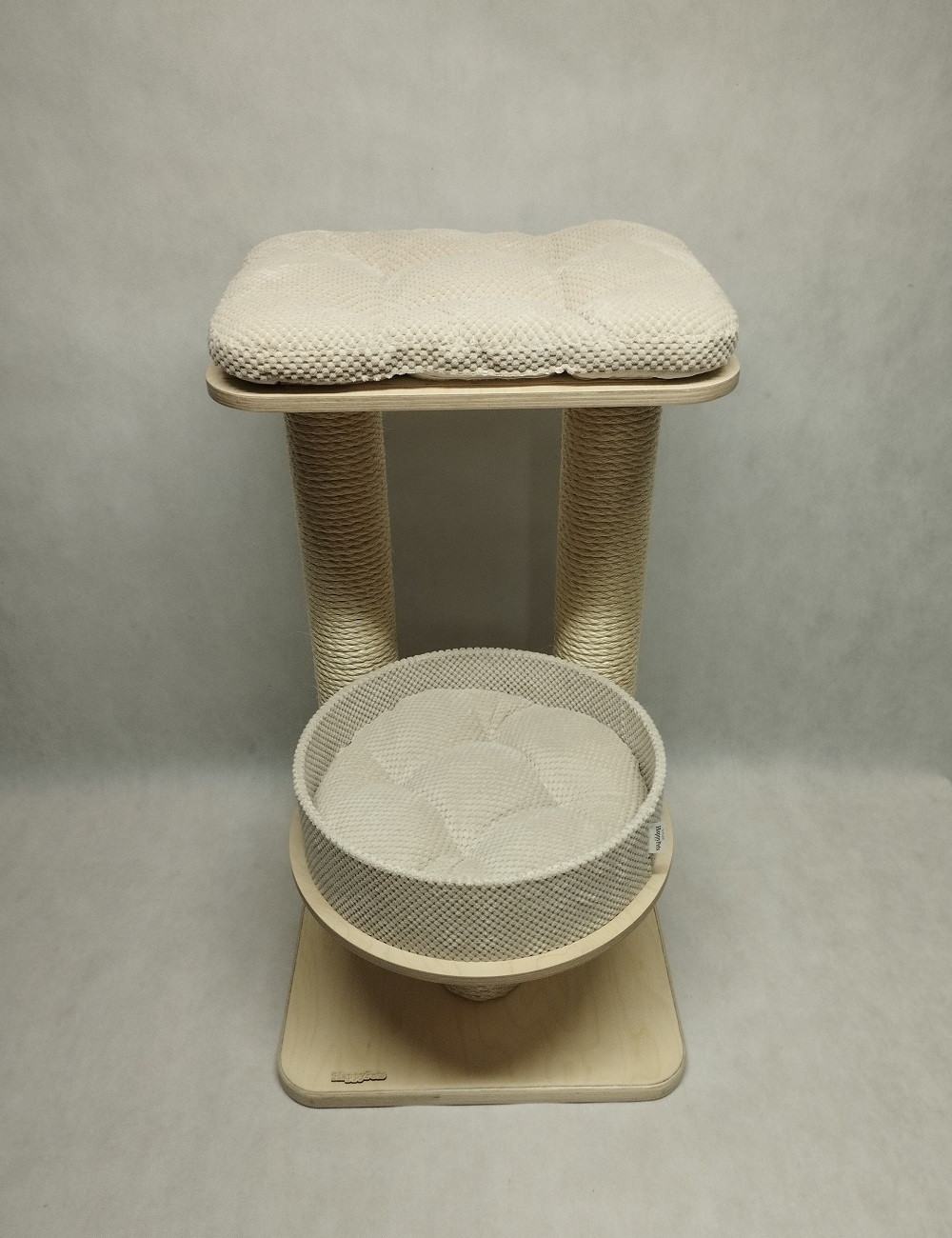 Na podstawie zamocowane są słupy oraz półka dla kota typu rozeta z miękką poduszką w środku.