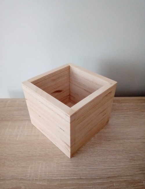Kwadratowa, ozdobna osłonka na doniczkę została wykonana ze sklejki wodoodpornej.
