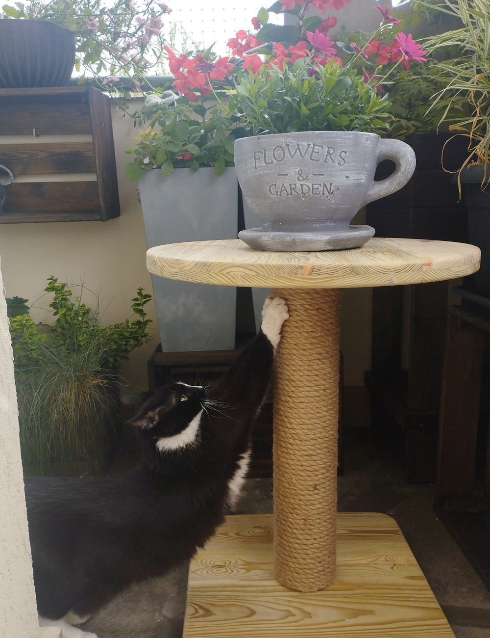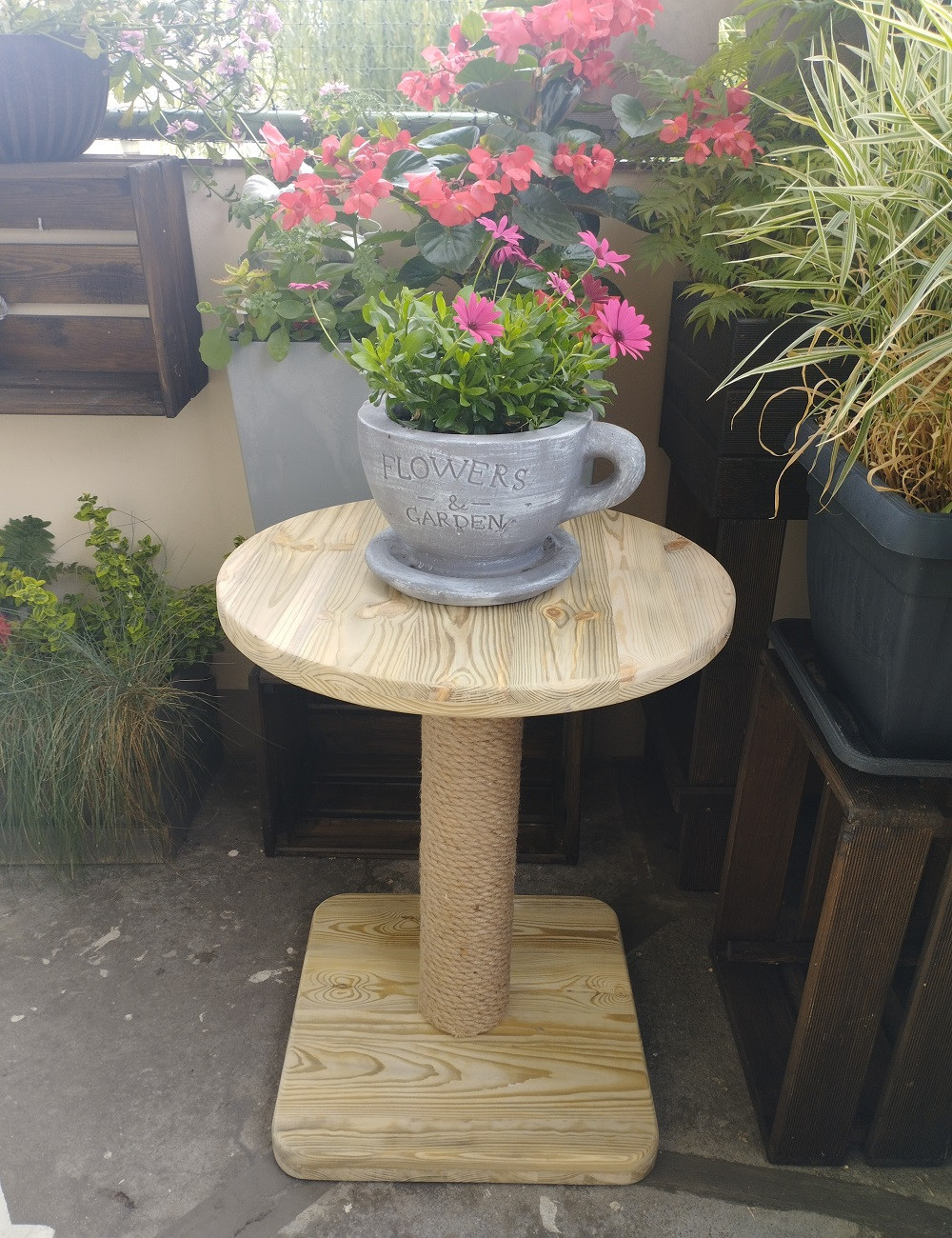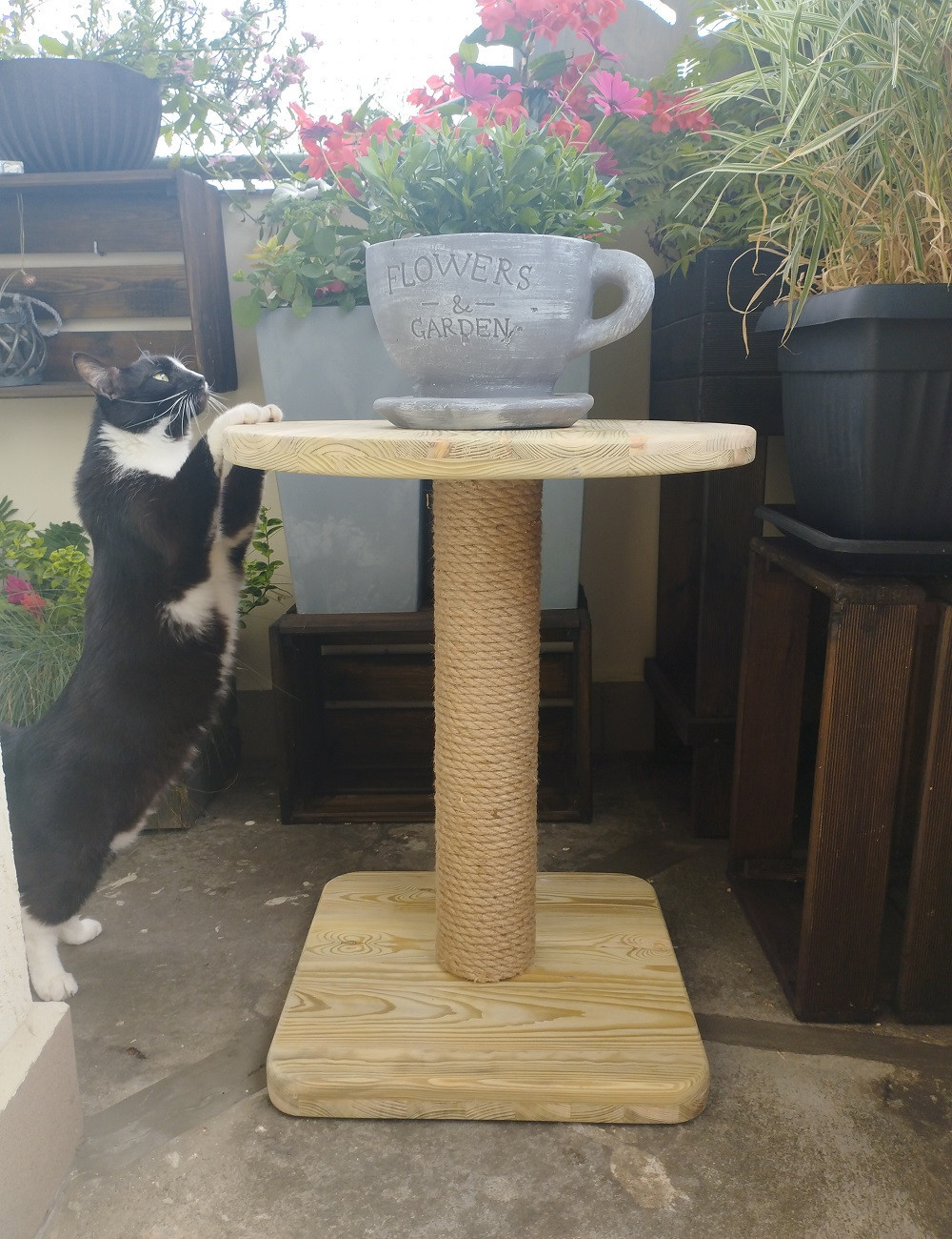 Stolik ze słupem do drapania dla kotów – drewno impregnowane ciśnieniowo, lina jutowa solidny, funkcjonalny i pięknie naturalny.
